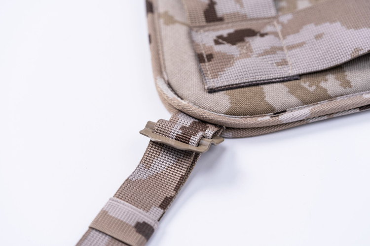 It has a steel plate loop that slide along the webbing and is used to fix the surplus part of the belt.