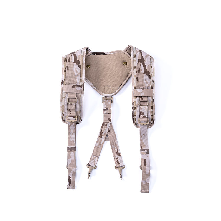 The two tapes that originate and measure 650mm long and 25mm wide. They are shaped as in the attached design and there are elastic tabs on this to gather up the surplus. The end that is joined to the adjustable buckle hemmed in such a way. The tape that starts from the back of the triangular piece has a useful length of 300mm and is 25mm wide. It has a 20-22 mm elastic loop to gather the surplus material.