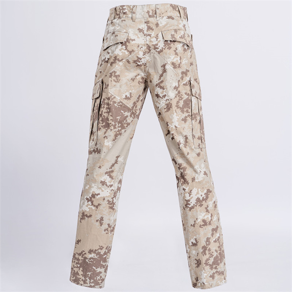 The trousers made up of legs, flap, waistband and pockets (upper and leg pockets).The bottoms will be overlocked, folded to the inside and overstitched. The left hand flap is formed with a false hem that is 45mm wide, with the free edges overlocked and a line of overstitching 30mm from the edge.The right hand flap is formed by a an extra piece of the same fabric, measuring 55mm wide, joined to the front by an overlocked seam.It has a waistband of double fabric, 40mm wide. It is joined to the trousers by a line of overstitching around its entire edge.The trousers has two side pockets. These pockets slanted and they will be reinforced at their ends by machine bar tacks. These two pockets is positioned below the hip line. They are superimposed on top of the side seams and attached around the edge by stitching.