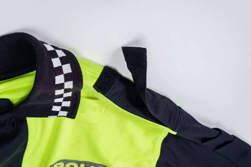 Front part is made up of two pieces: an upper piece in a high visibility yellow colour and a lower piece in a dark navy. It has an epaulette sleeve-holder on each shoulder, It is sewn onto the join of the shoulder with the sleeve; the other end, at the area close to the neck.