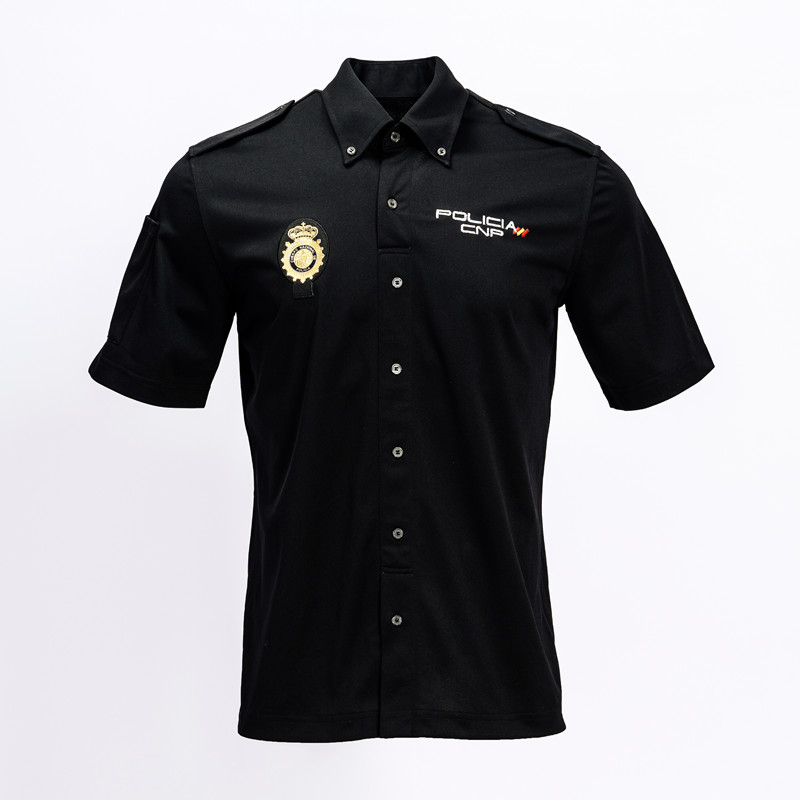 Short-sleeved polo shirt, in men’s and women’s versions. It is made up of 2 fronts without darts and with a false flap at the centre, back, sleeves, collar with buttons and epaulettes.