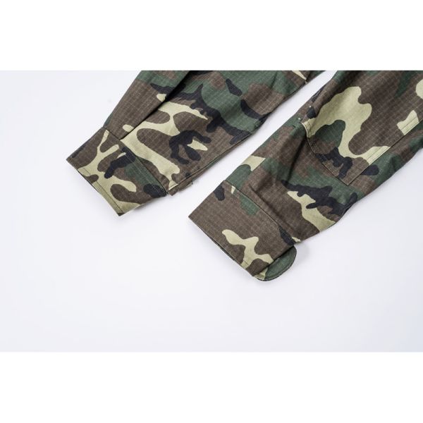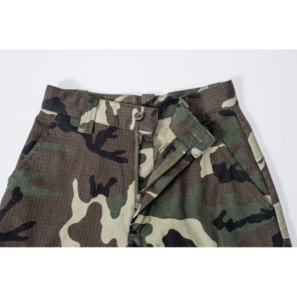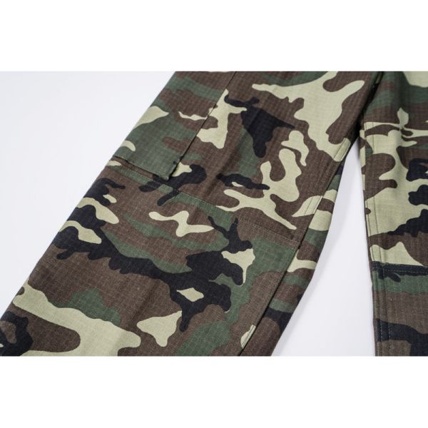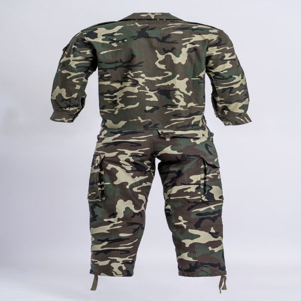 The trousers made up of legs, flap, waistband and pockets (upper and leg pockets).The bottoms will be overlocked, folded to the inside and overstitched. The left hand flap is formed with a false hem that is (45 ± 2) mm wide, with the free edges overlocked and a line of overstitching (30 ± 2) mm from the edge.The right hand flap is formed by a an extra piece of the same fabric, measuring (55 ± 5) mm wide, joined to the front by an overlocked seam.It has a waistband of double fabric, (40 ± 2) mm wide. It is joined to the trousers by a line of overstitching around its entire edge.The trousers has two side pockets. These pockets slanted and they will be reinforced at their ends by machine bar tacks. These two pockets is positioned below the hip line. They are superimposed on top of the side seams and attached around the edge by stitching.