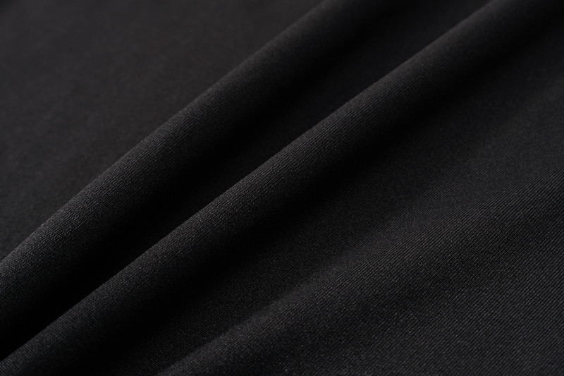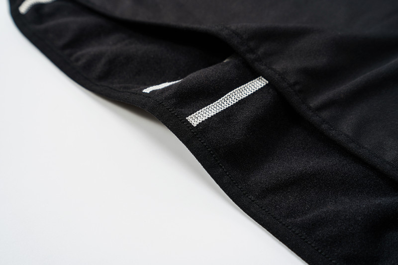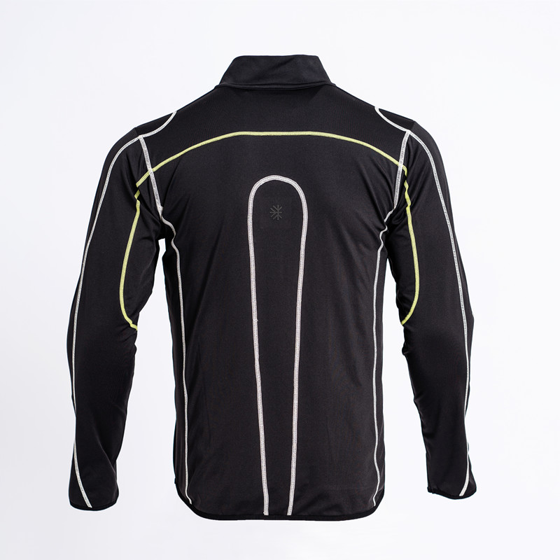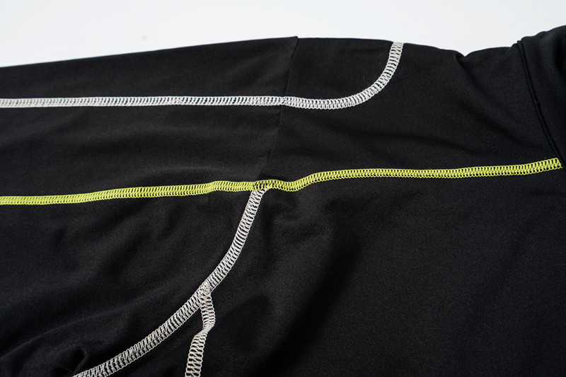 It is sports track suit, made by high quality of polyamide/elastic fabric. Both front and back body are made by 2 pieces fabric.Each two pieces for whole garment,the union seams between both front and these with the rear and the rest of the pieces,they are flat to avoid discomfort to the user. The collar is made by 2 layer fabric exactly same as body material.