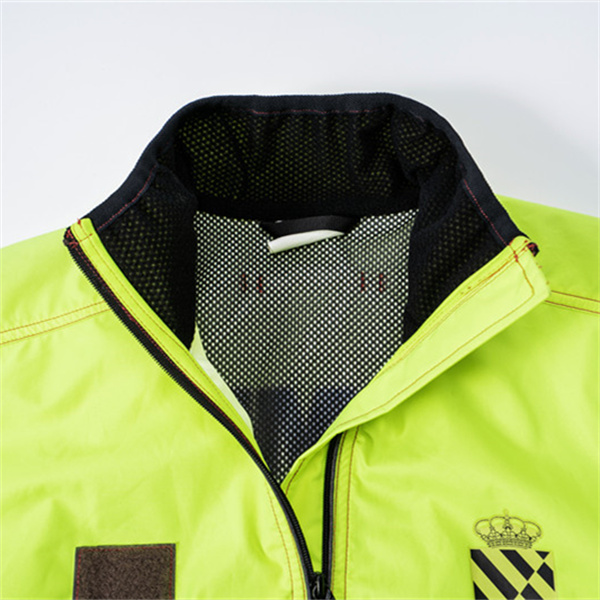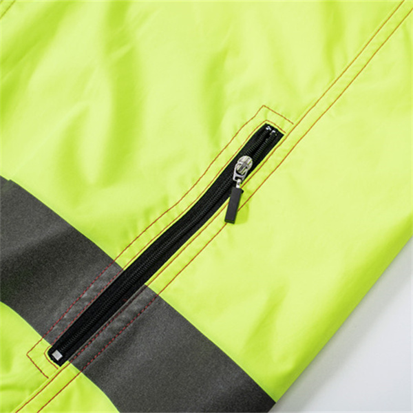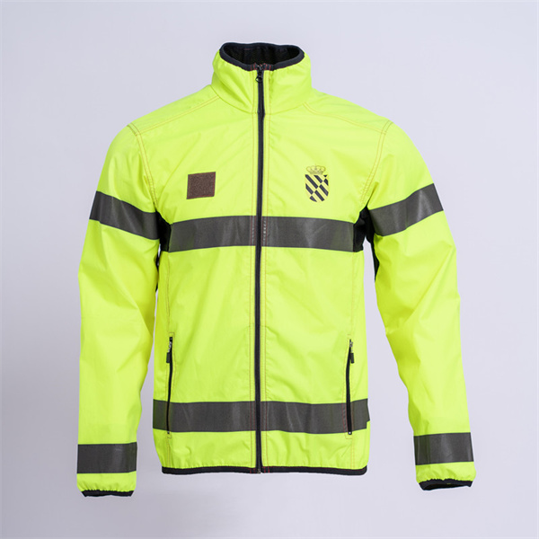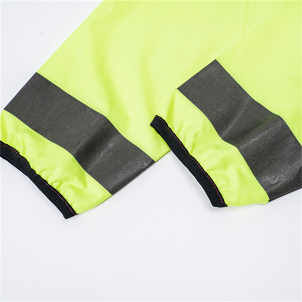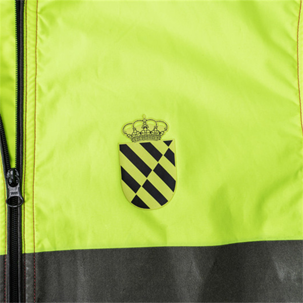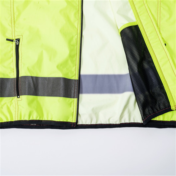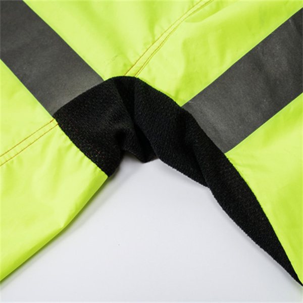 The fabric is reflective yellow coating PU inside of part. Meet standard of EN 20471. Both chest and bottom there is a 5CM width reflective band heating with fabric.