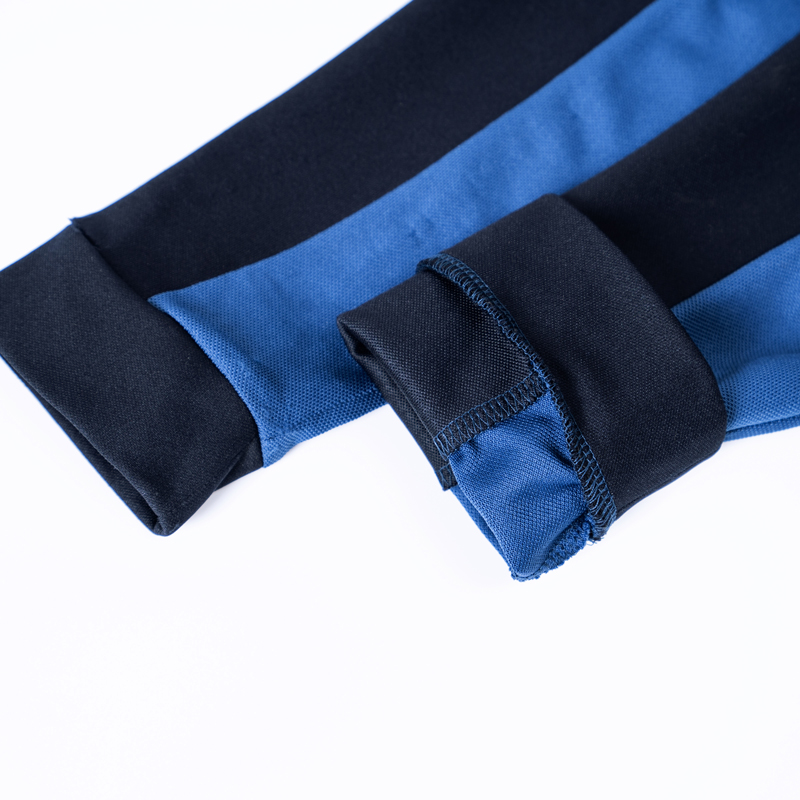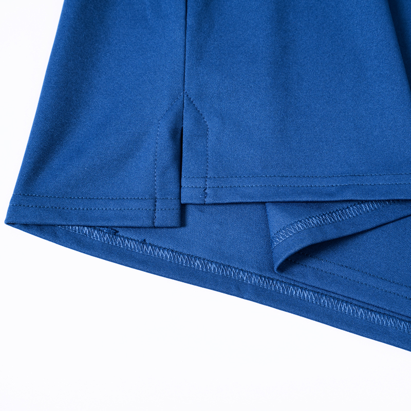 Back body consist of two parts: same color as front side. At the bottom of polo, the seam is cut, leaving a 5 cm opening,this opening is completed by a hem of about 15 mm. The length of the back is larger than the front, exceeding the front by 20 mm.