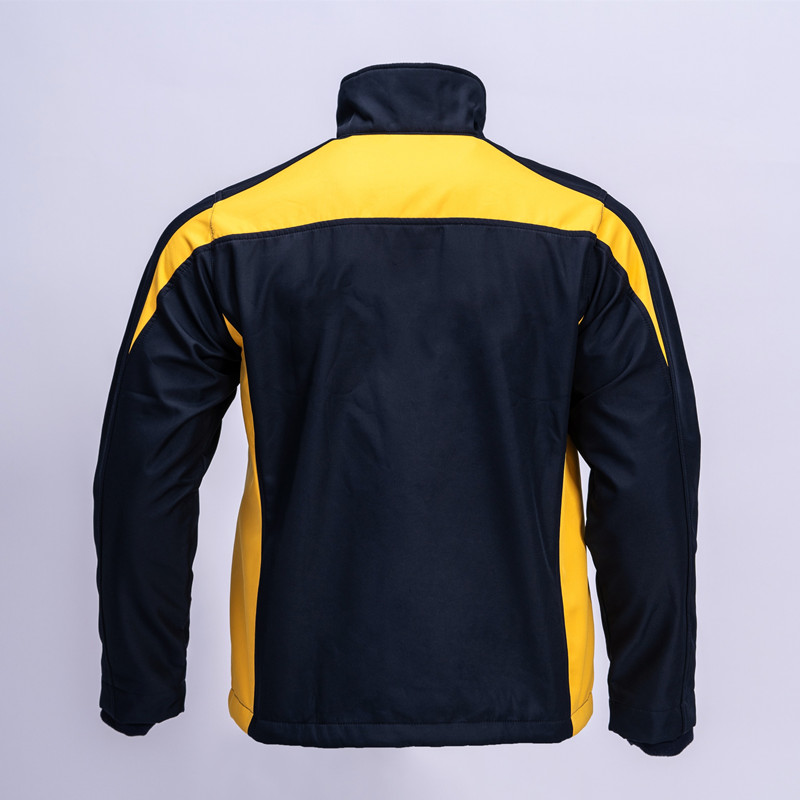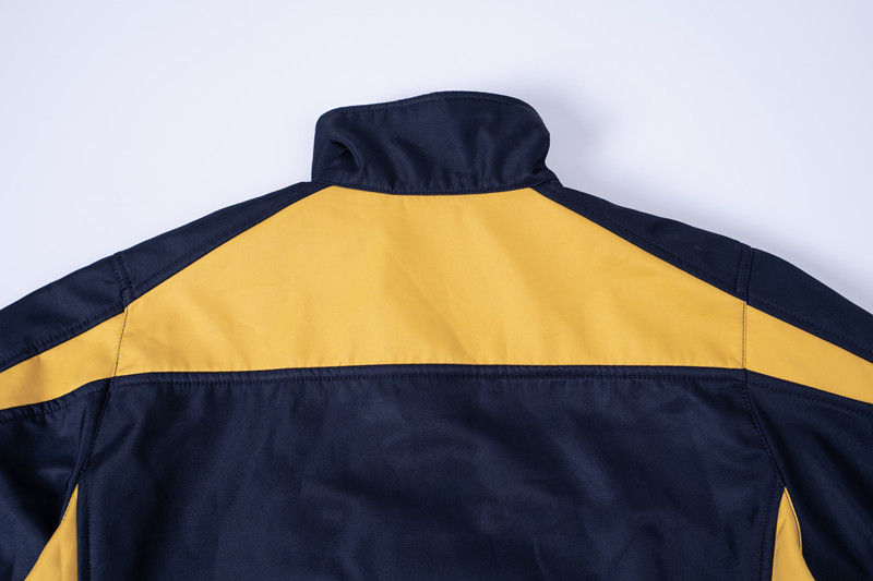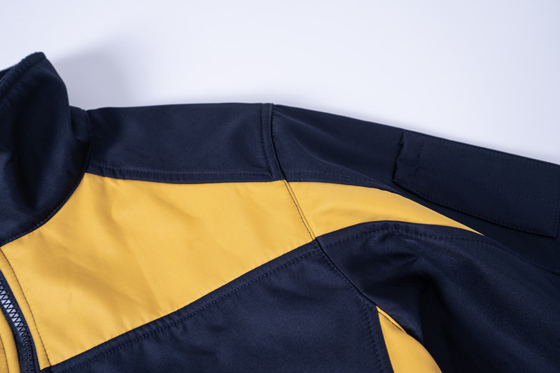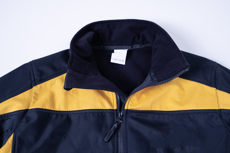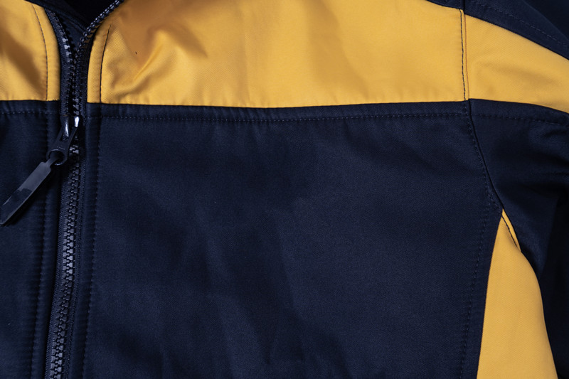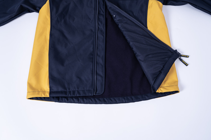 The garment, closed by a two-cursored waterproof zip fastener. It is made by two colors, the front and back yoke exclude collar, the upper part of shoulder, are yellow color. Other part are all navy blue as photo.